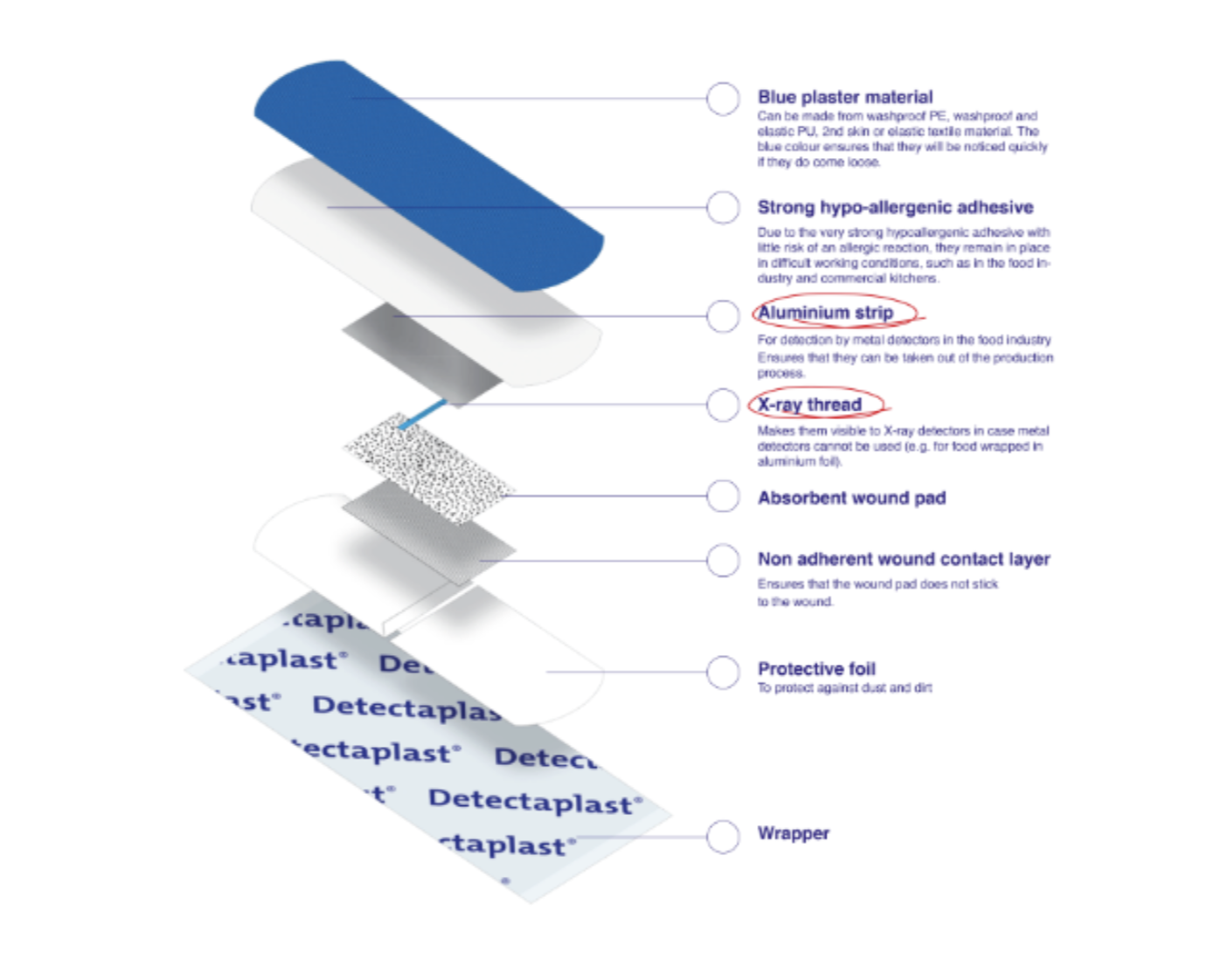 – door een extra aluminium film kunnen de pleister door metaaldetectoren gedetecteerd worden