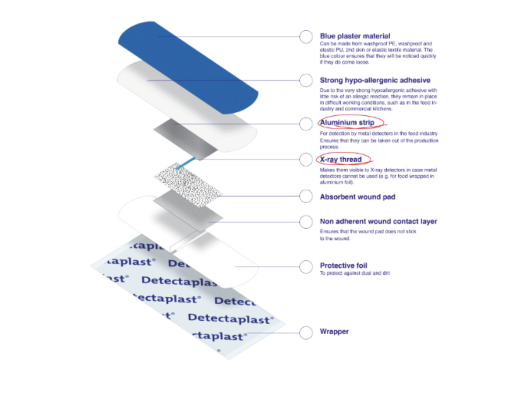 – door een extra aluminium film kunnen de pleister door metaaldetectoren gedetecteerd worden,