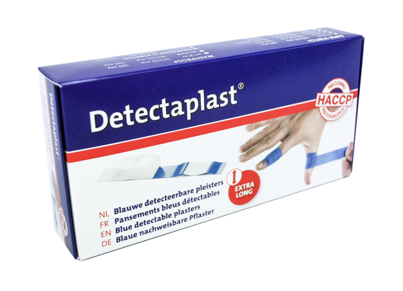Deze lange blauwe detecteerbare vingerpleisters zijn geschikt voor gebruik in keukens of de levensmiddelenindustrie. Door de blauwe kleur vallen ze goed op en ze zijn voorzien van een detectiefolie.