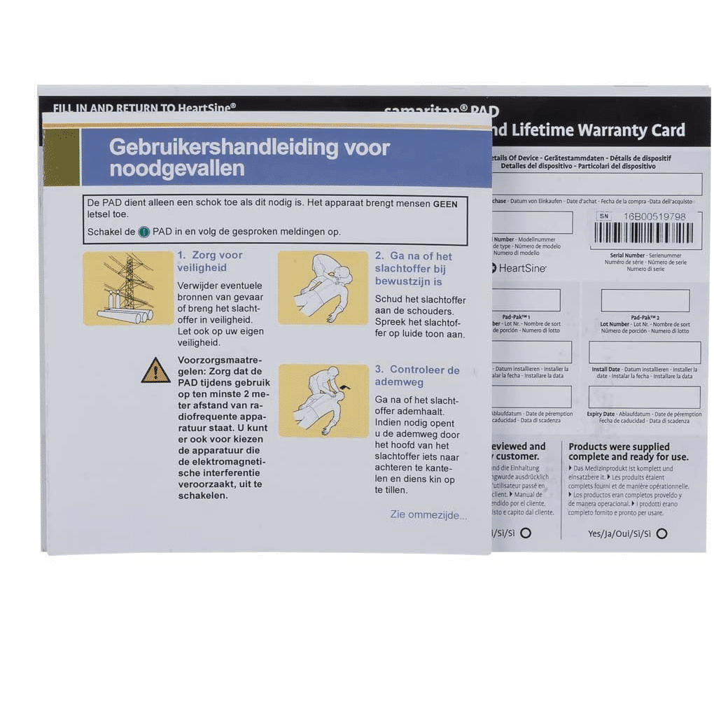 - Elektroden en Batterij (PadPak): Gecombineerde elektroden en batterij met een houdbaarheid van 4 jaar.