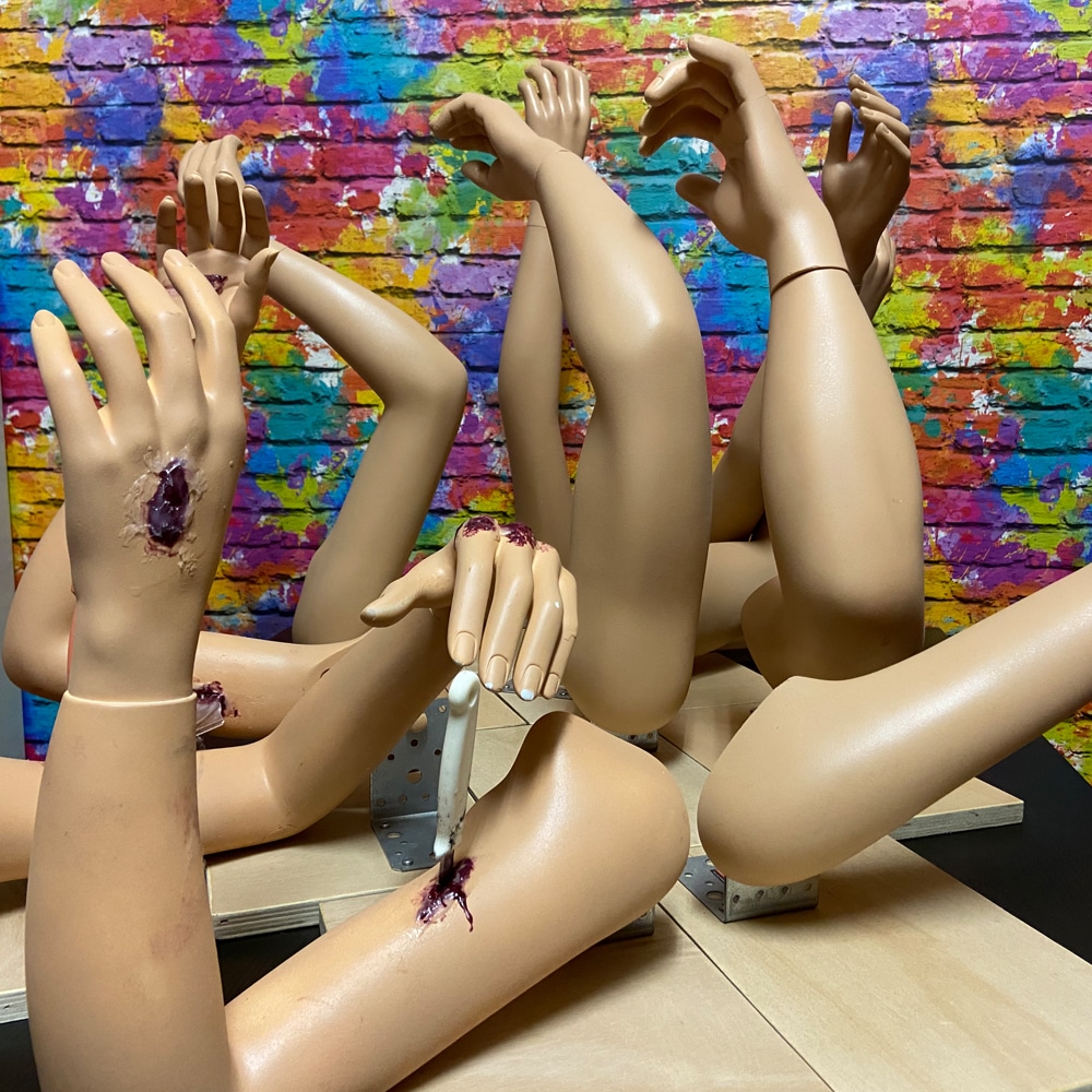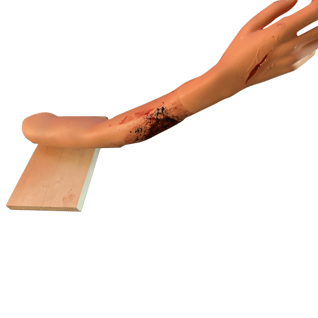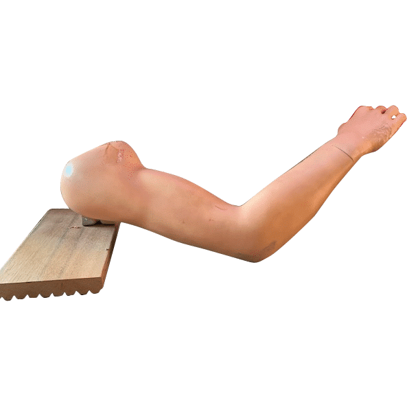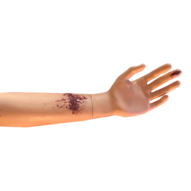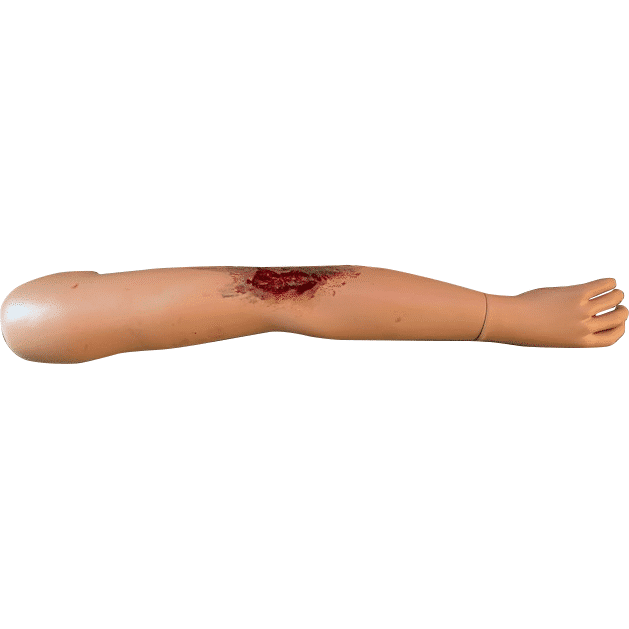 De oefenarm is in huidskleur gespoten met anti-sliplaag zodat het verbandmateriaal niet te snel verschuift, met verwonding van siliconen er op gemaakt, zodat deze vaker te gebruiken is.