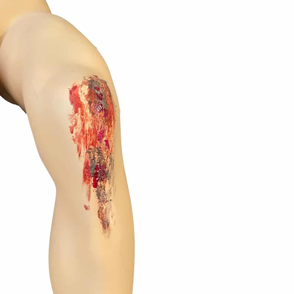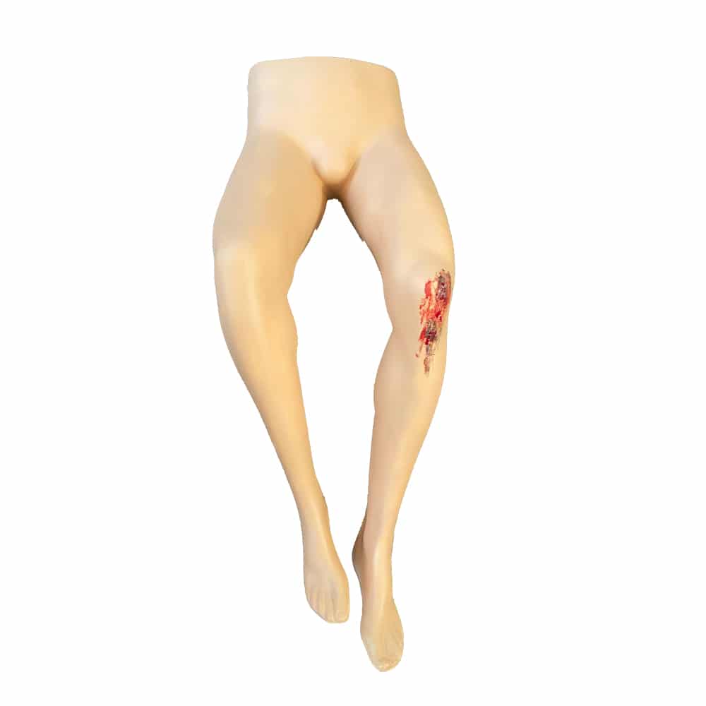 Door het realistische formaat leert de cursist op de juiste manier verband aan te leggen op de oefenbenen. De verwonding is gemaakt van siliconen waardoor het opnieuw te gebruiken is.