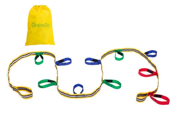 De Grab & Go kan worden gebruikt als wandelkoord voor korte wandelingen met kinderen en als een hulpmiddel bij brandoefeningen en evacuatie-oefeningen. De Grab & Go is leverbaar in uitvoeringen voor 5, 6, 10 en 12 kinderen. Indien gewenst kunnen meerdere Grab & Go’s aan elkaar worden bevestigd.