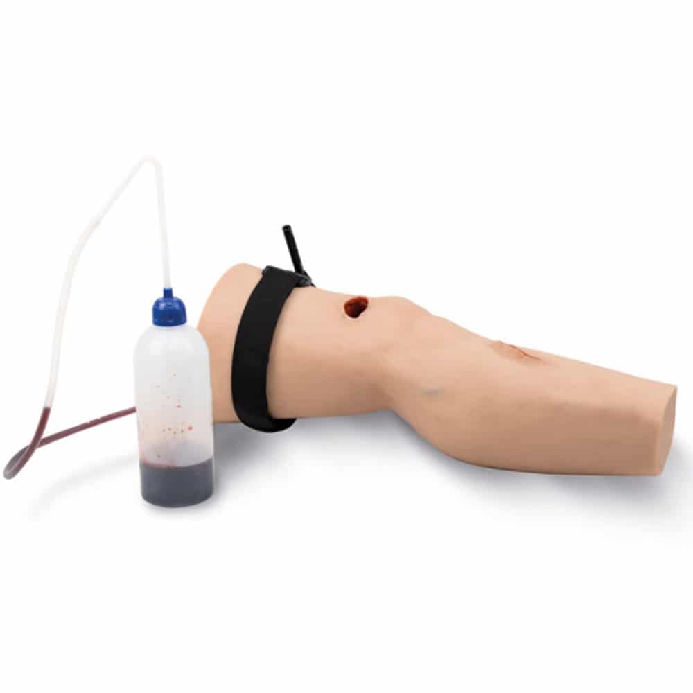 Oefen eerstehulpmaatregelen en beheer een grote bloeding met het traumabeen. De trainer stelt een gewond been voor met snijwonden, schotwonden en schotwonden. Je kunt directe druk uitoefenen, de wond inpakken met gaas, een drukverband plaatsen en de tourniquet aanbrengen om het bloeden echt te stoppen (tourniquet niet inbegrepen).