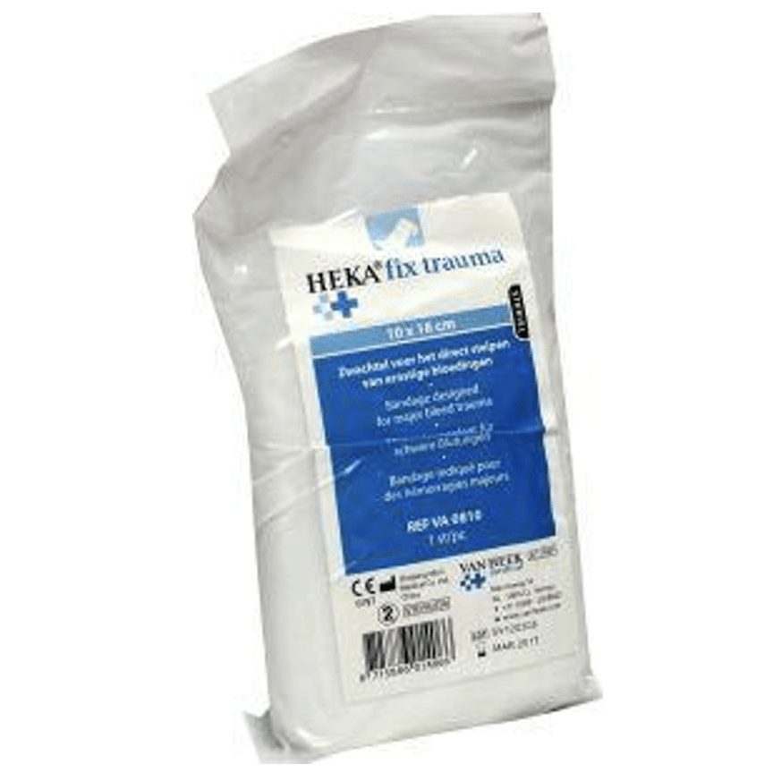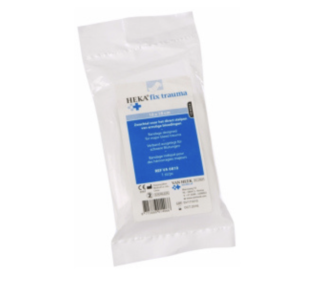 Een traumaverband is als nuttige toevoeging aangegeven door Het Oranje Kruis in de nieuwe 2021 richtlijn voor verbandkoffers. De afbeelding die in de lesstof wordt weergegeven is afwijkend van de Heka fix trauma maar kan ook probleemloos worden ingezet.